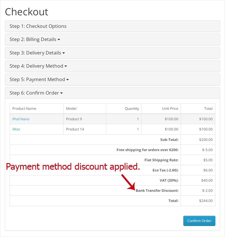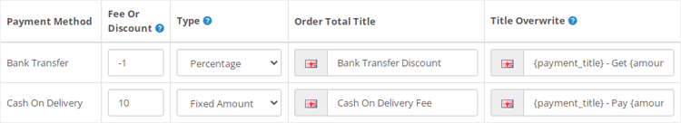 Using this extension, You can set a discount or fee for each payment method. The extension also allows you to Overwrite the title of payment methods. It is possible to determine the amount both as a fixed amount or as a percentage.